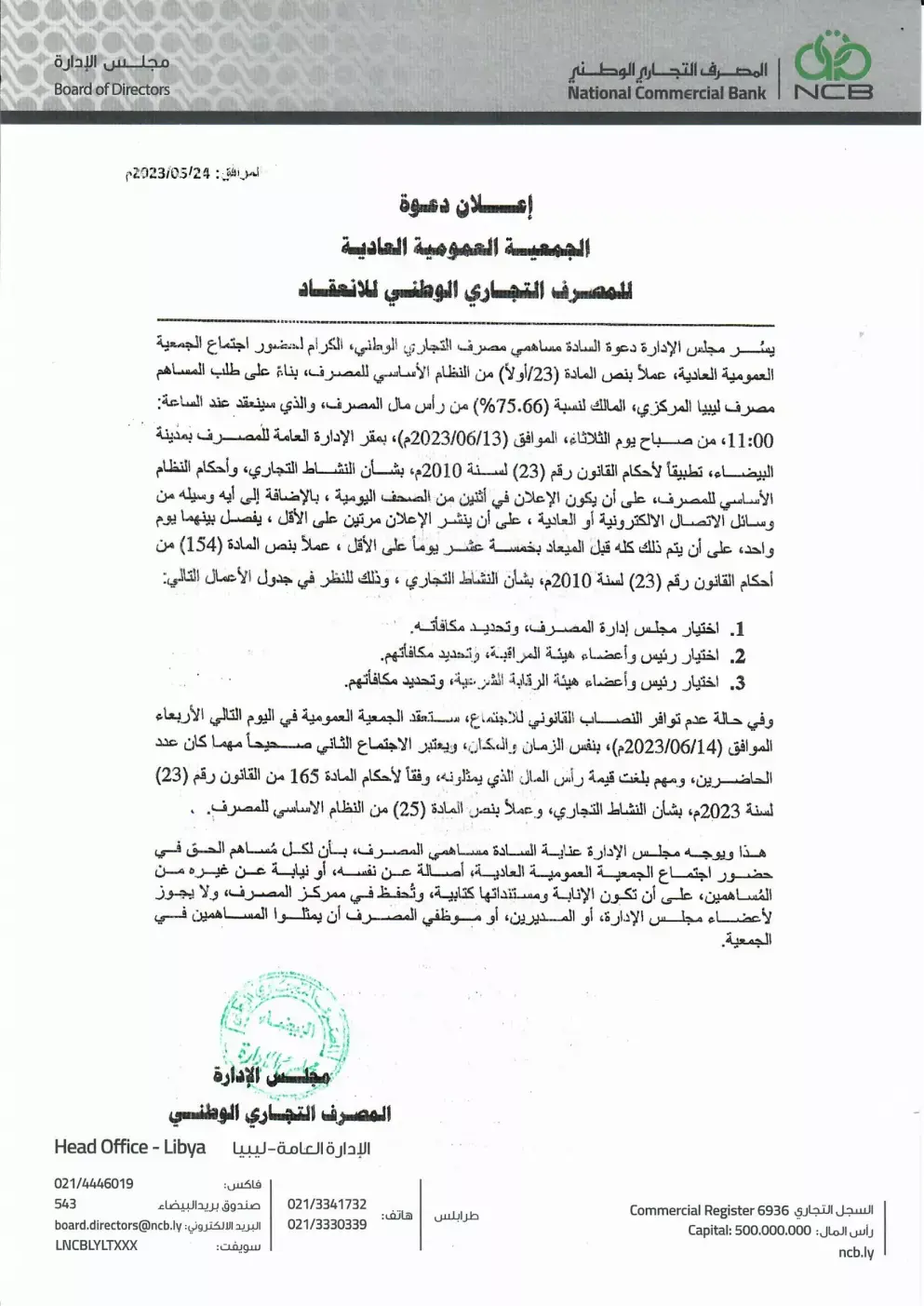 NCB Board of Directors Announces its Invitation for Attending Ordinary General Assembly Meeting for the year 2023 on Tuesday 13 June 2023 at 11:00 am at NCB Head quarter in AlBaida City