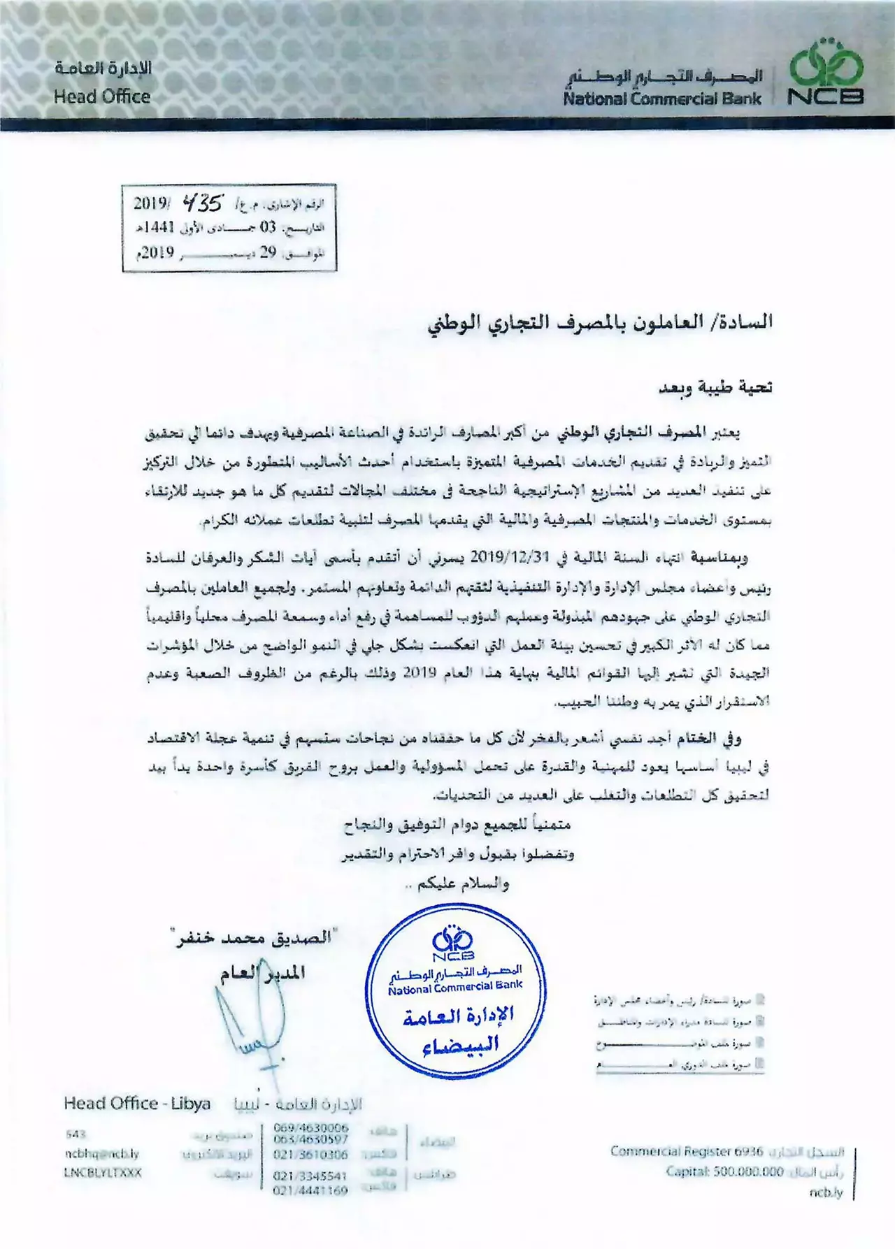 At the end of the financial year 2019, the General Manager of the National Commercial Bank, Mr. Al-Siddiq Mohammed Khanfar, expressed his sincere thanks and gratitude to NCB Chairman, members of the Board of Directors, and the Executive Management for their permanent trust and continuous cooperation. In the same note of appreciation, Mr. Khanfar thanked all the employees at the National Commercial Bank for their efforts and hard work to raise the performance and reputation of NCB both locally and regionally.