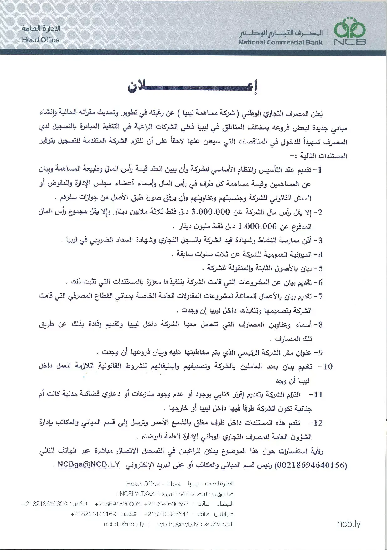 The National Commercial Bank announces its desire to develop and renew its existing branches and to establish new buildings for some of its branches in different regions in Libya. Companies wishing to execute must register with the bank in order to enter into tenders that will be announced later