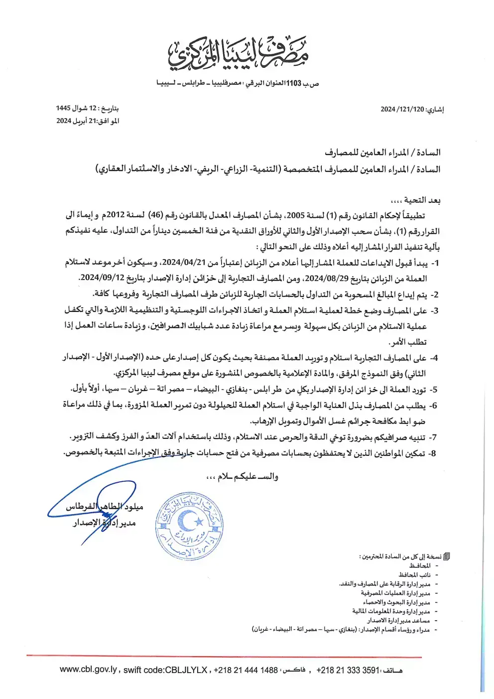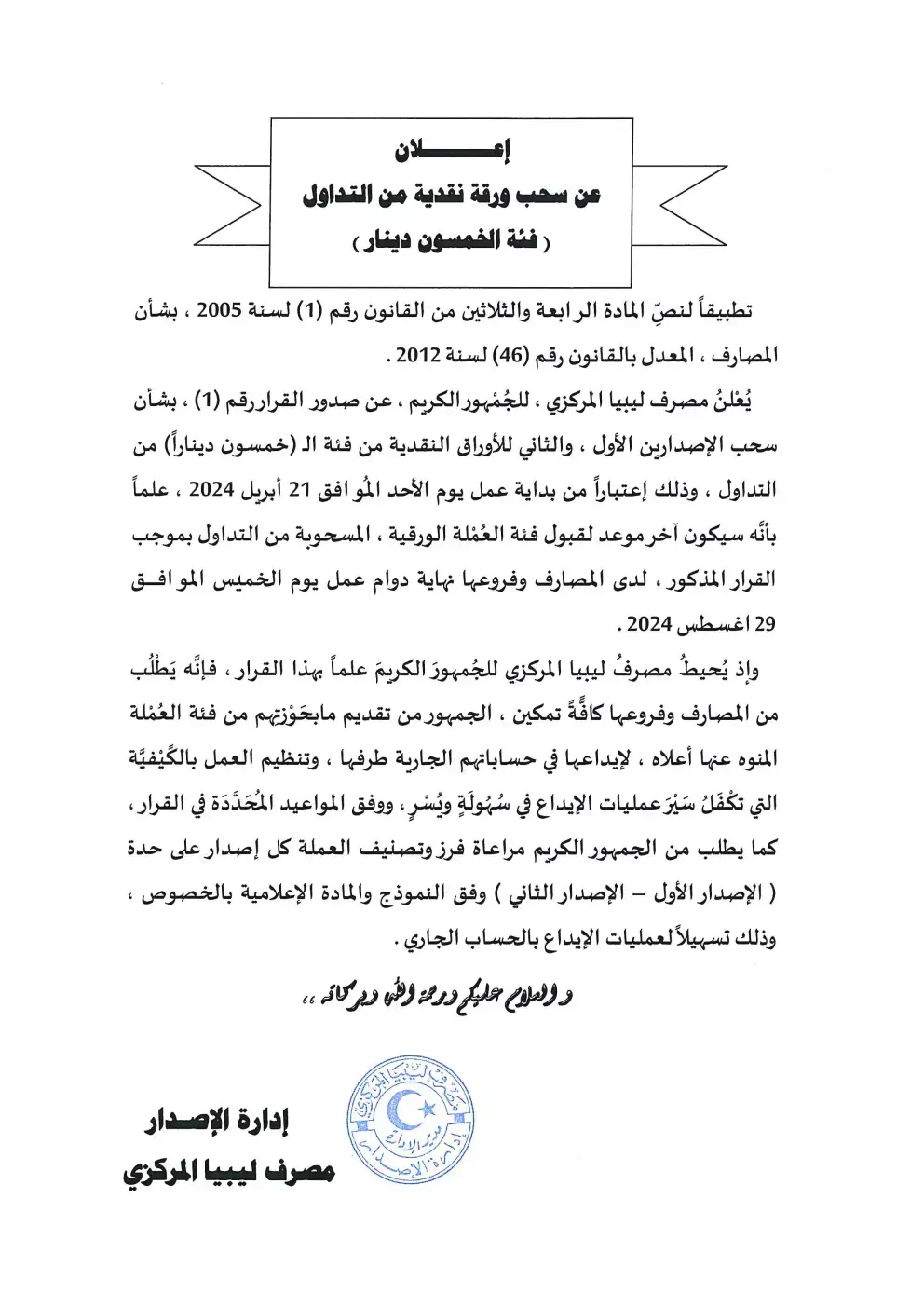 With reference to the announcement of the Libyan Central Bank regarding the withdrawal of the first and second issues of the fifty (50) dinar, we inform you that the bank will organize cash deposits of the fifty dinar denomination in all the branches that will be designated to accept these deposits after preparing them and organizing the work mechanism so that all the bank’s customers can By depositing what they possess from this category in an easy way.
